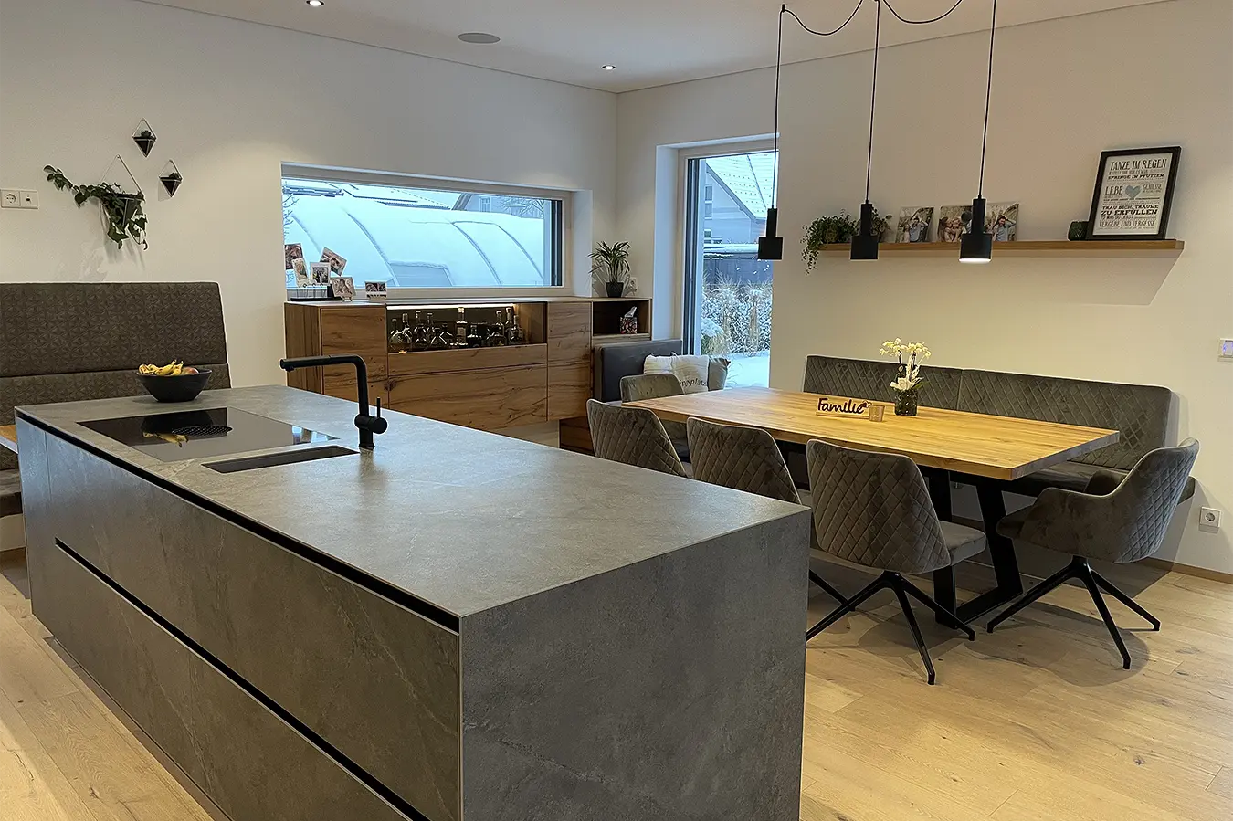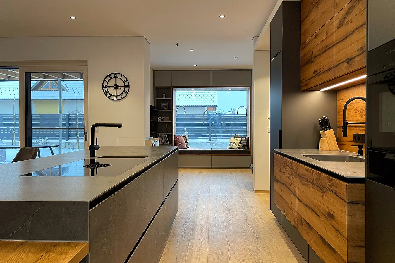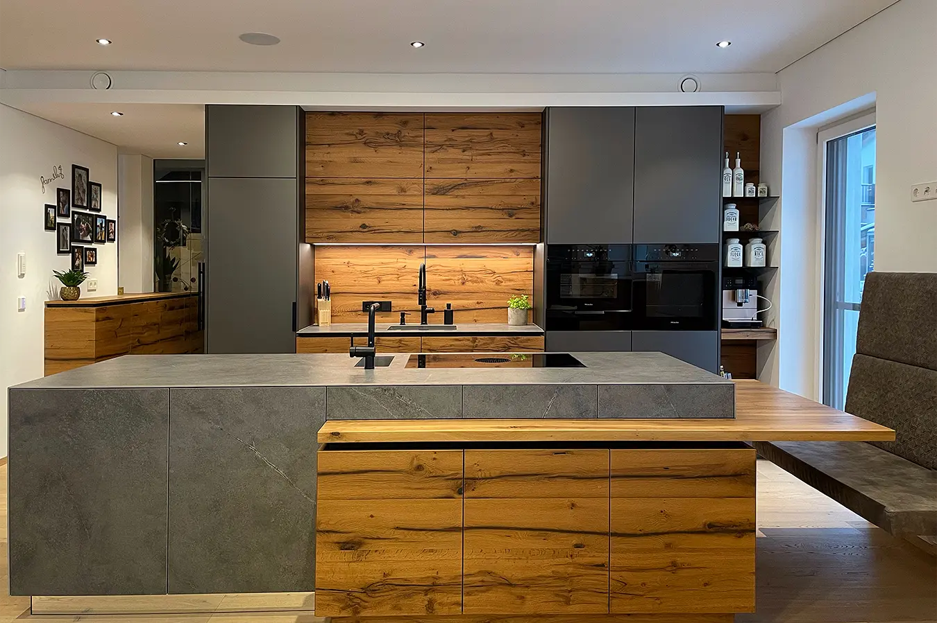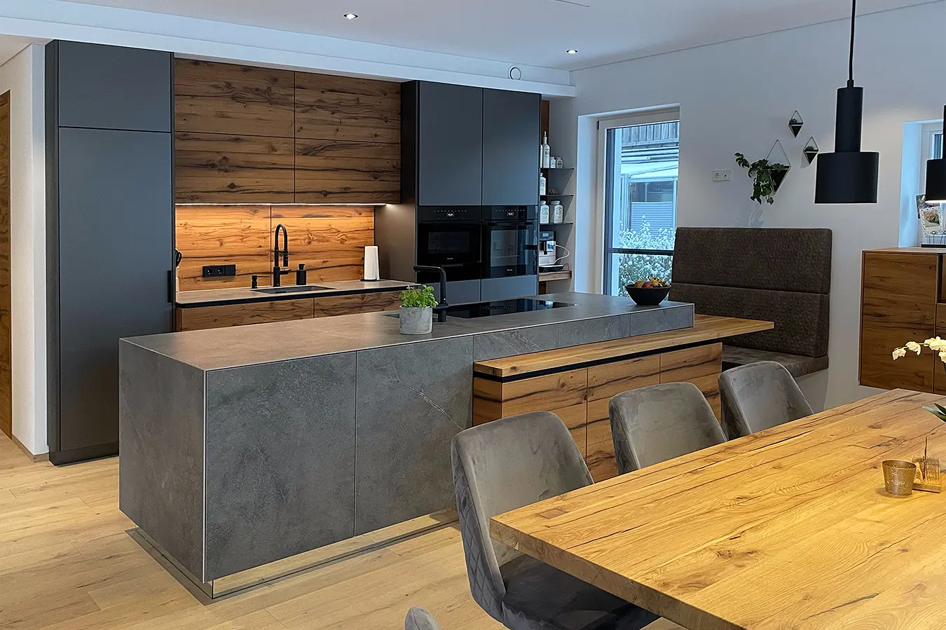 Dieses durchgängige Designkonzept vereint moderne Betonoptik und mattschwarzen Küchenfronten, die für einen zeitgemäßen Look sorgen. Die warmen Akzente der Risseiche schaffen eine einladende Atmosphäre, während durchdachte Details wie ein gemütliches Lesefenster, eine beleuchtete Schnapsvitrine und eine versteckte Durchreiche zur Speis Funktionalität und Stil perfekt kombinieren.
