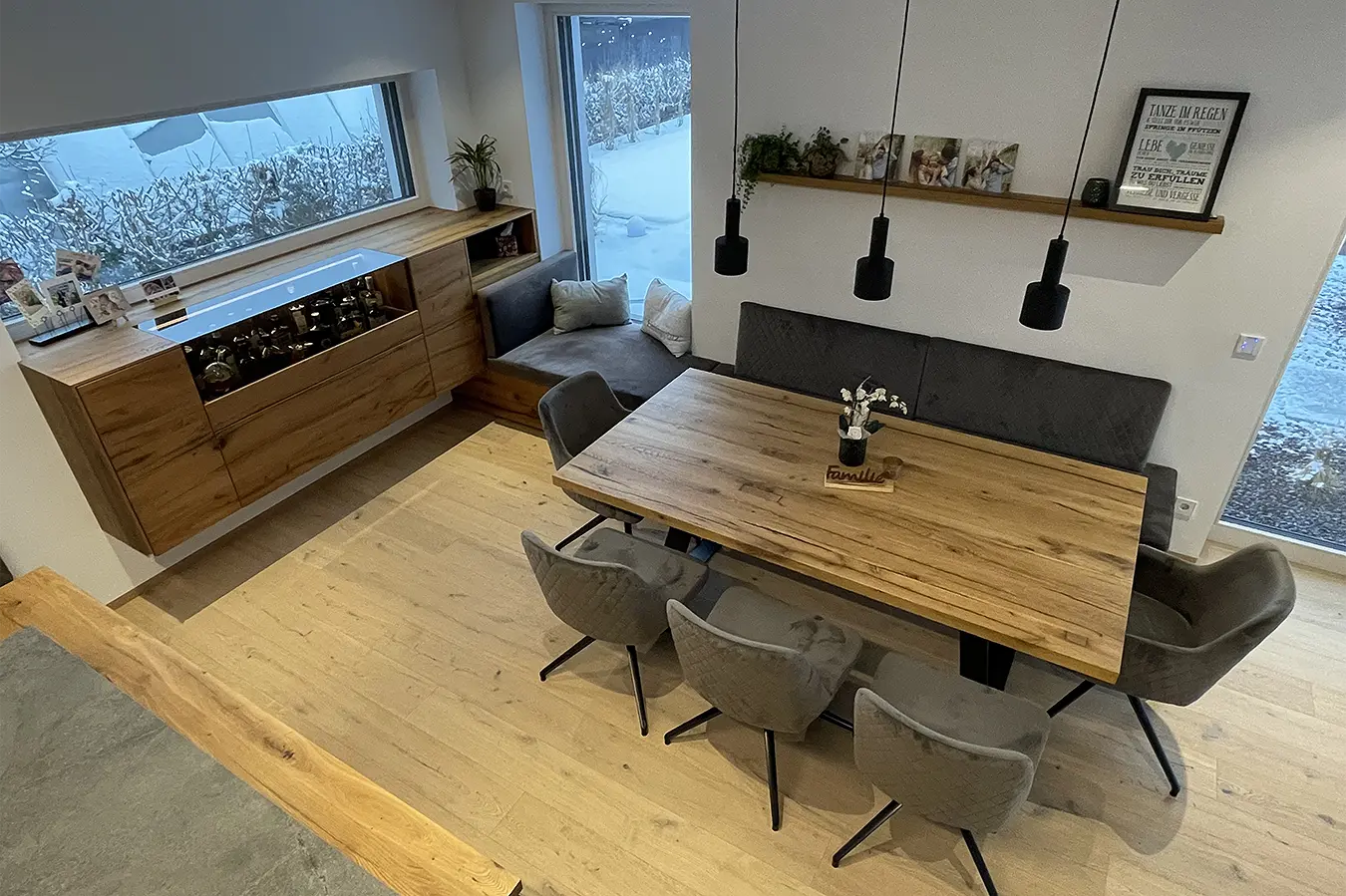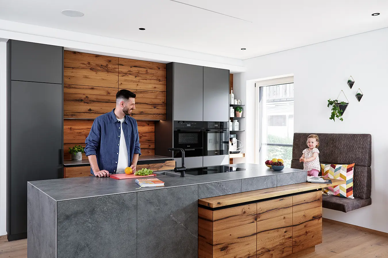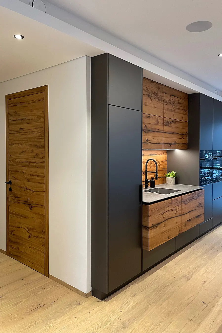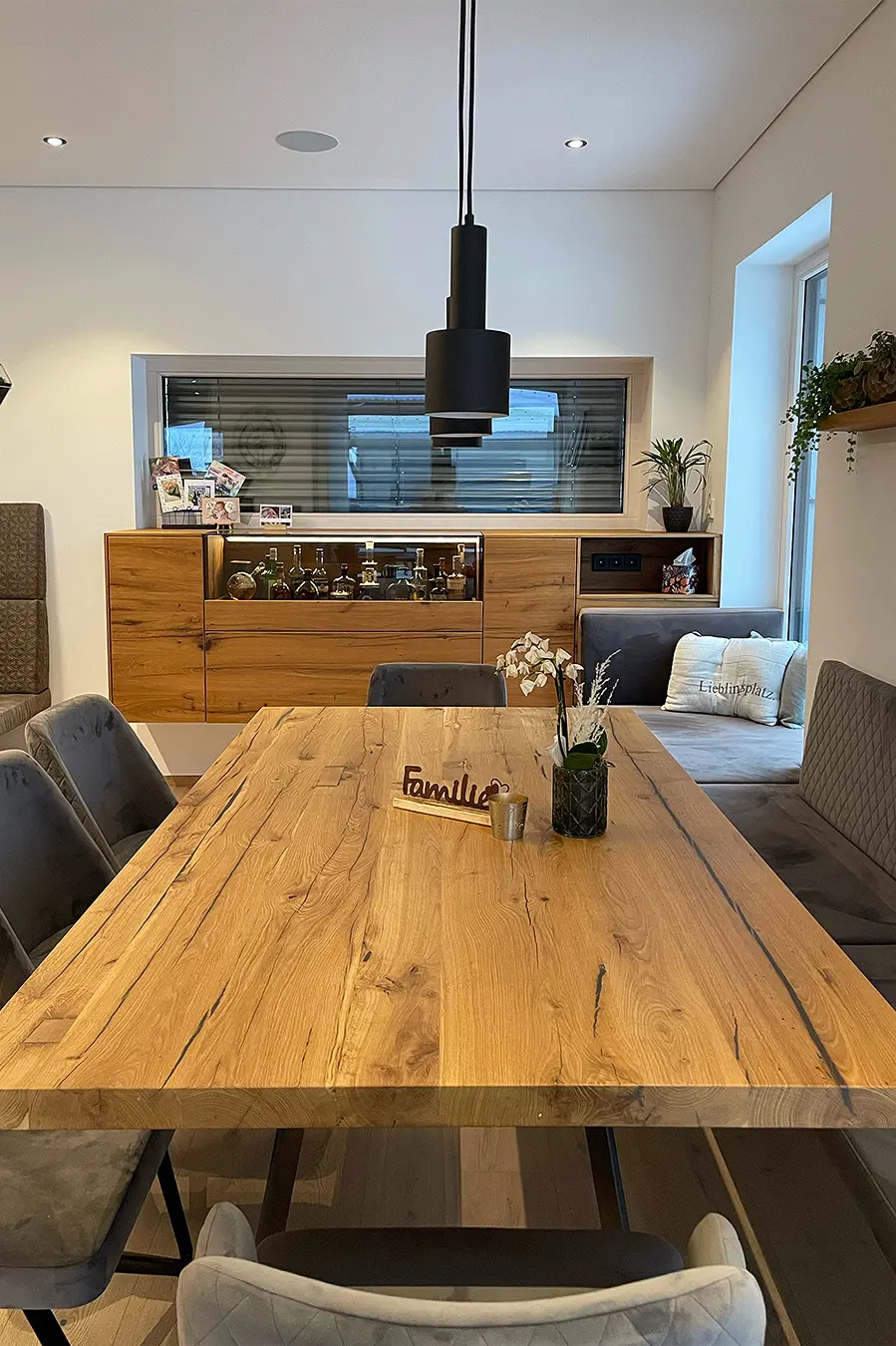 Dieses durchgängige Designkonzept vereint moderne Betonoptik und mattschwarzen Küchenfronten, die für einen zeitgemäßen Look sorgen. Die warmen Akzente der Risseiche schaffen eine einladende Atmosphäre, während durchdachte Details wie ein gemütliches Lesefenster, eine beleuchtete Schnapsvitrine und eine versteckte Durchreiche zur Speis Funktionalität und Stil perfekt kombinieren.