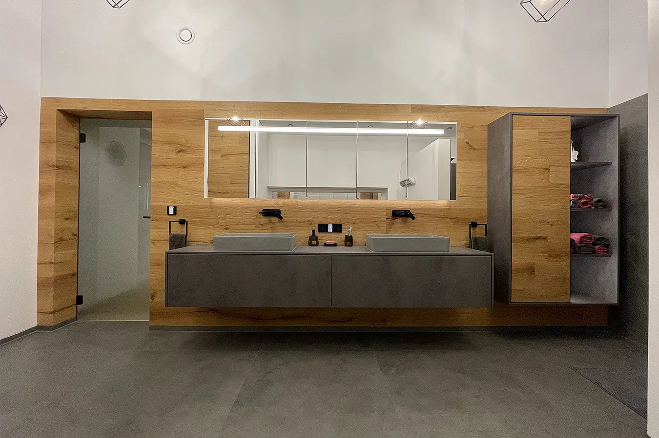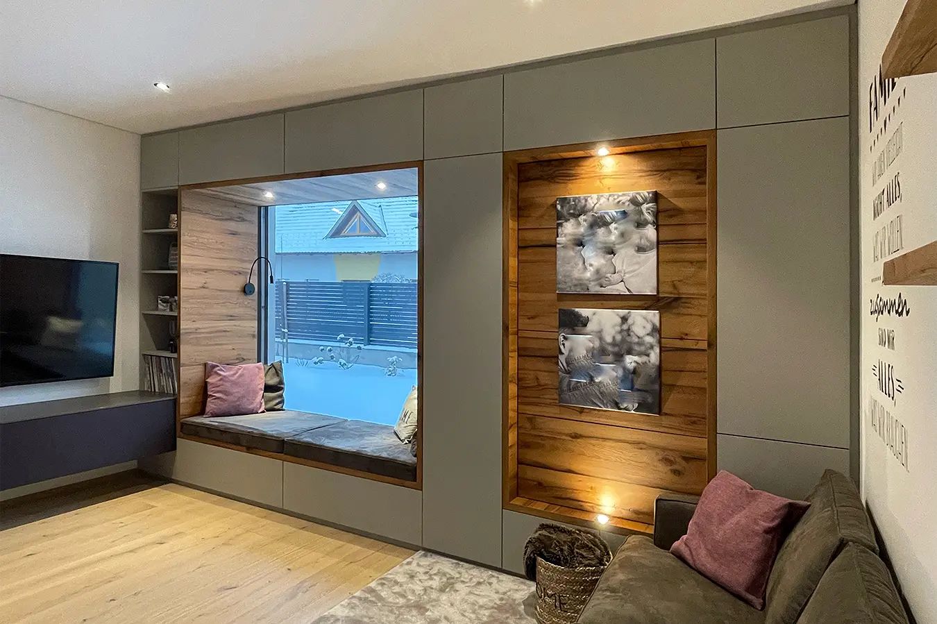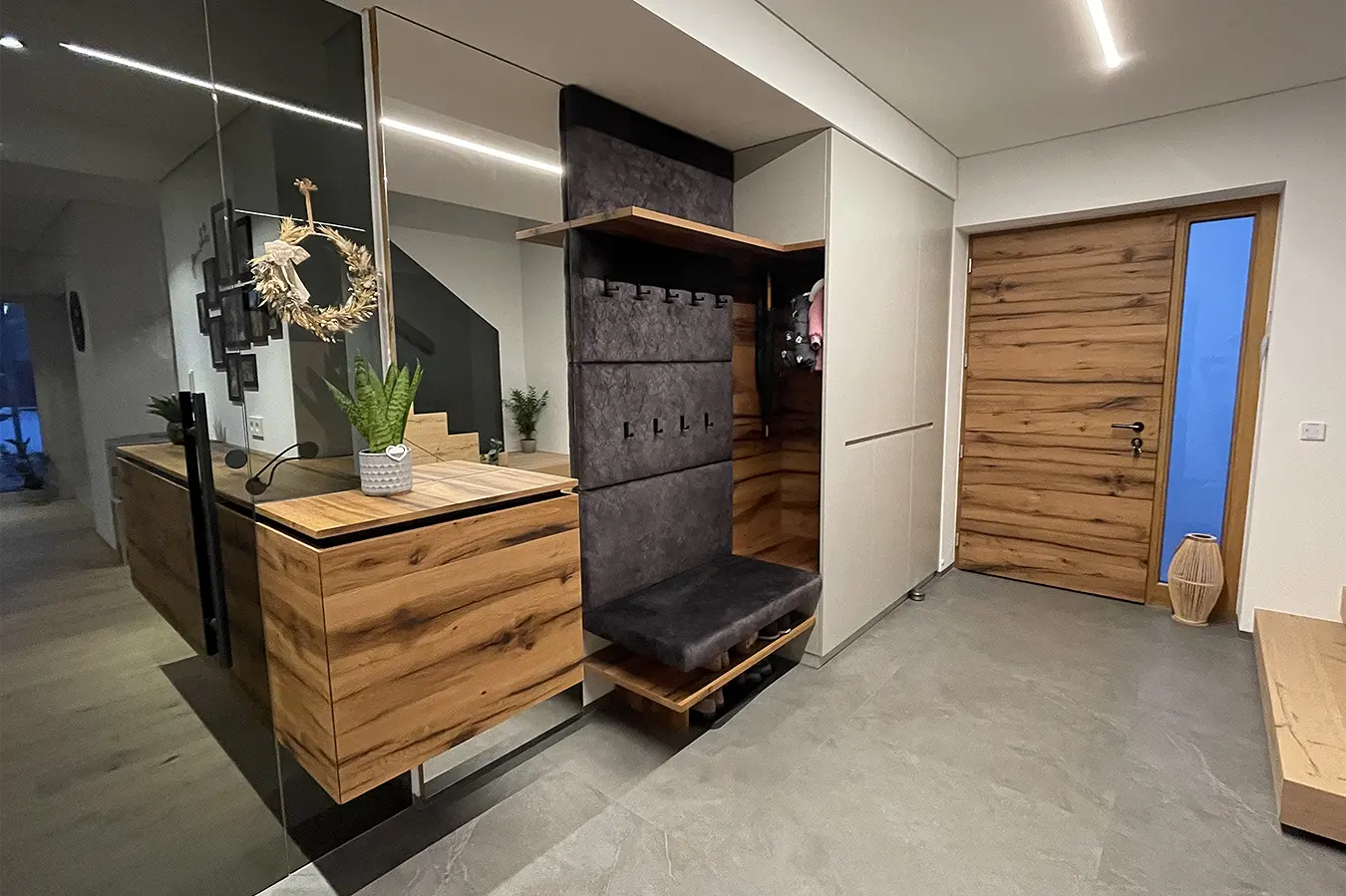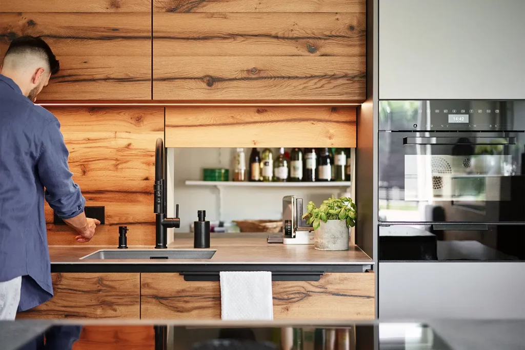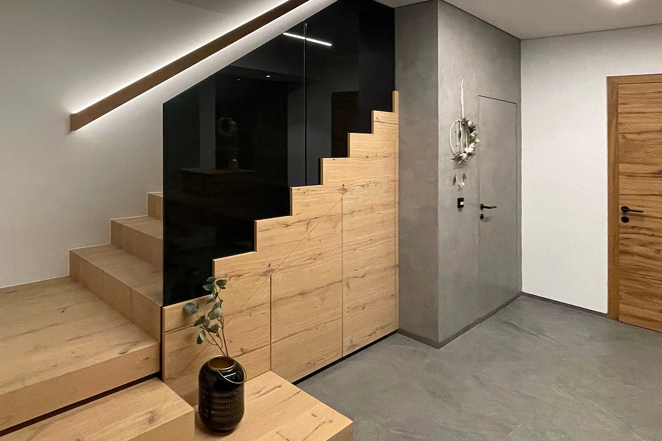 Dieses durchgängige Designkonzept vereint moderne Betonoptik und mattschwarzen Küchenfronten, die für einen zeitgemäßen Look sorgen. Die warmen Akzente der Risseiche schaffen eine einladende Atmosphäre, während durchdachte Details wie ein gemütliches Lesefenster, eine beleuchtete Schnapsvitrine und eine versteckte Durchreiche zur Speis Funktionalität und Stil perfekt kombinieren.