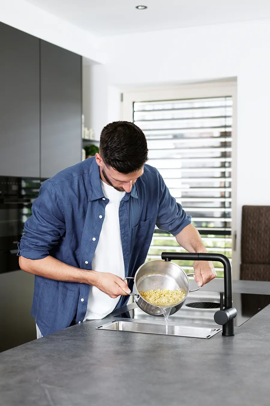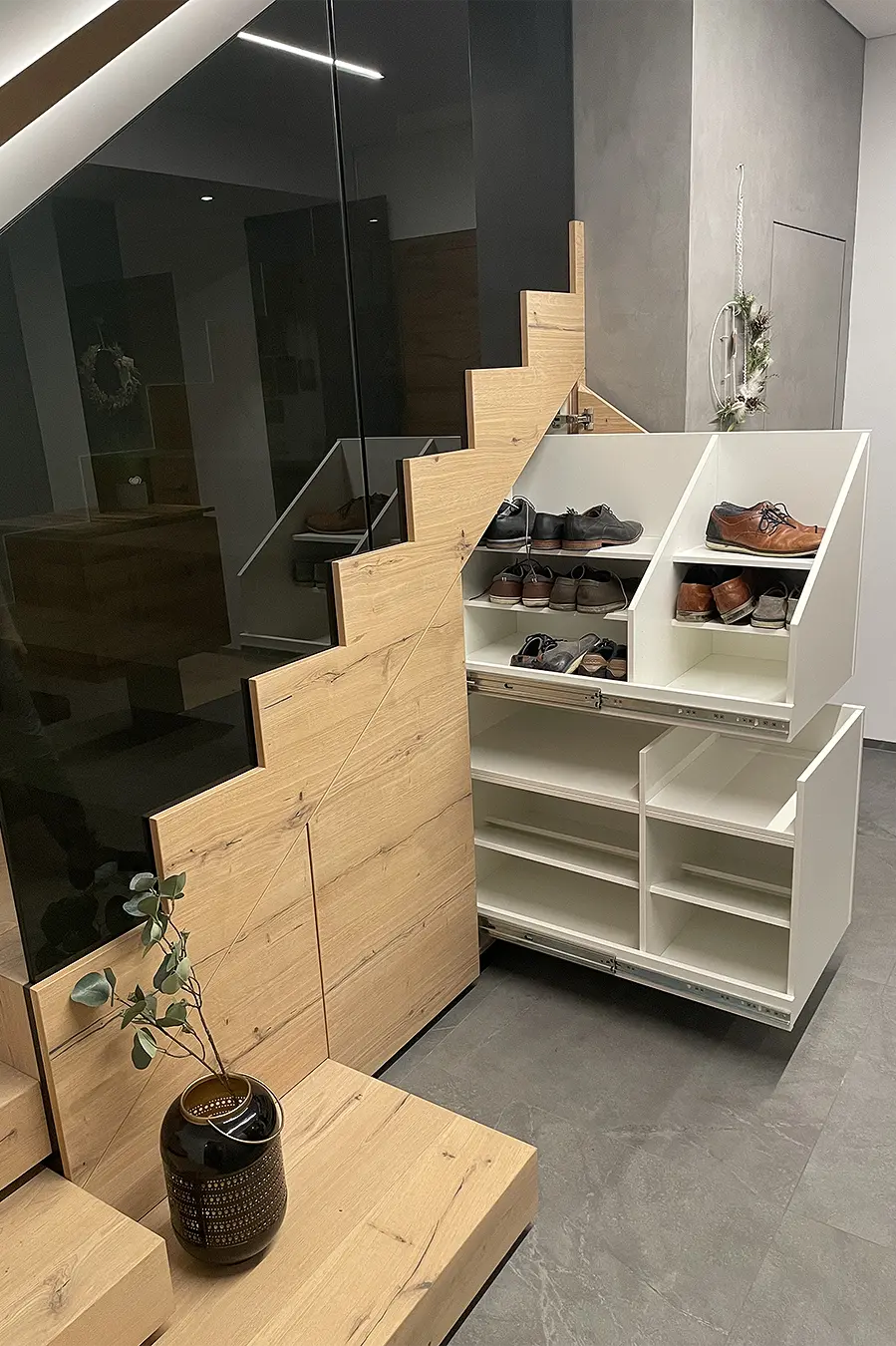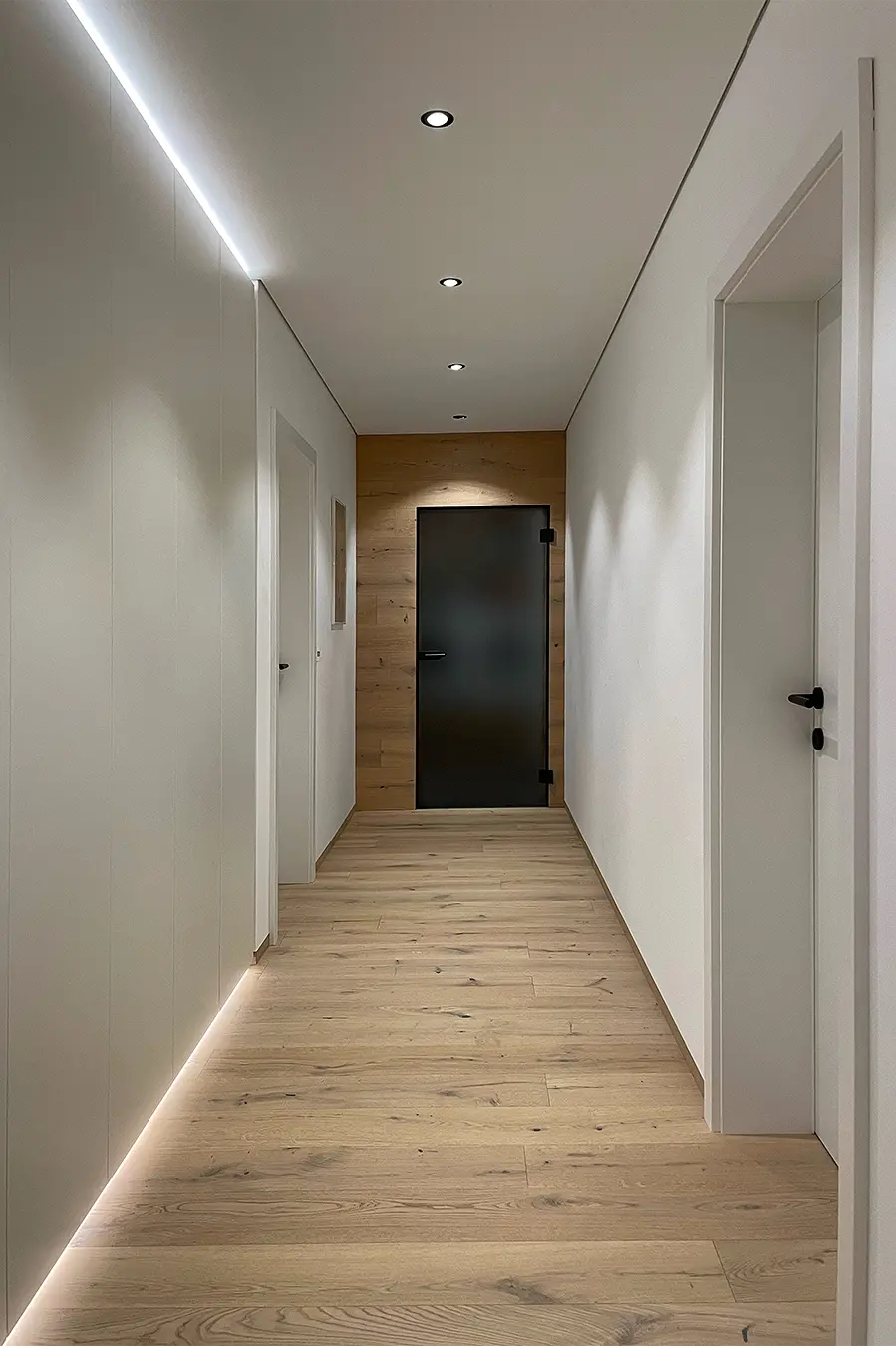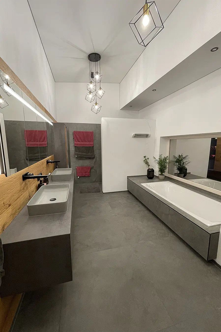 Dieses durchgängige Designkonzept vereint moderne Betonoptik und mattschwarzen Küchenfronten, die für einen zeitgemäßen Look sorgen. Die warmen Akzente der Risseiche schaffen eine einladende Atmosphäre, während durchdachte Details wie ein gemütliches Lesefenster, eine beleuchtete Schnapsvitrine und eine versteckte Durchreiche zur Speis Funktionalität und Stil perfekt kombinieren.