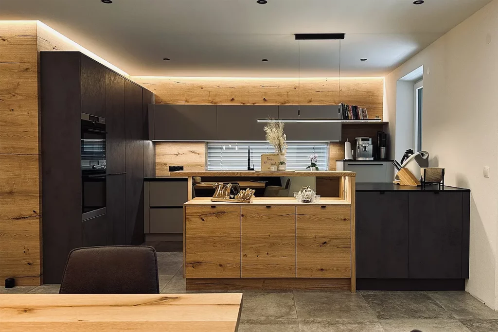 Diese gemütliche Küche lädt zum Verweilen und effizienten Kochen ein. Die Holzelemente in Kombination mit indirekter Beleuchtung sorgen für eine Wärme, die den Mittelpunkt des familiären Zuhauses ausmacht. Dankbare Betonfronten lassen Fingerabdrücke verschwinden und kaschieren den Eingang zur verstecken Spei. Sie sorgt für Ordnung, Stauraum und zusätzliche Arbeitsfläche, ohne das Raumgefühl zu stören!